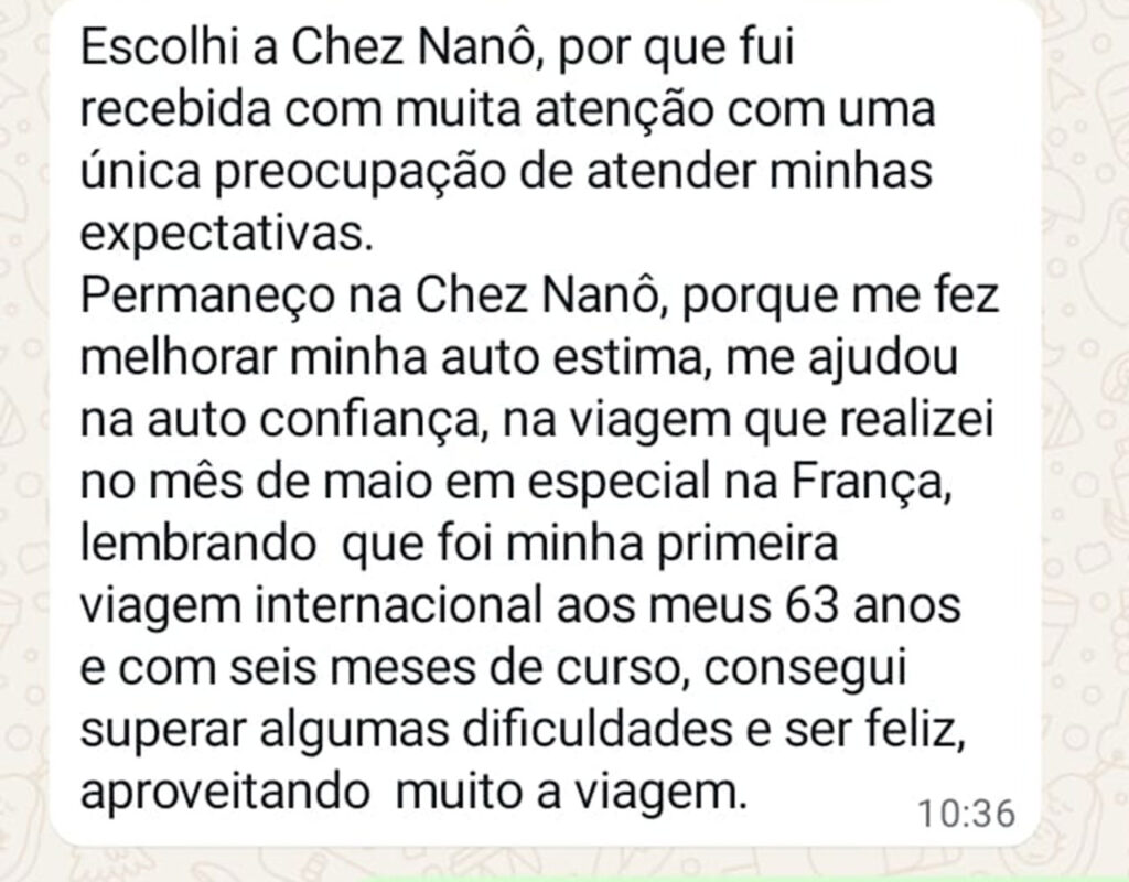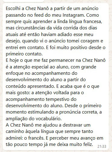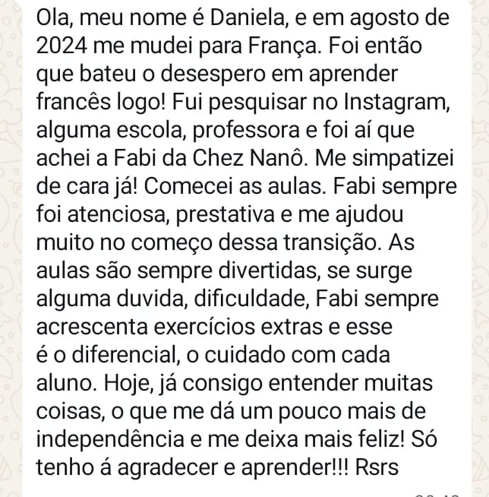 Hoje tenho uma escola online de francês, a Chez Nanô, que oferece aulas particulares individuais e em pequenos grupos, para adultos, adolescentes e crianças a partir de 8 anos, além de cursos gravados e guias de viagens.